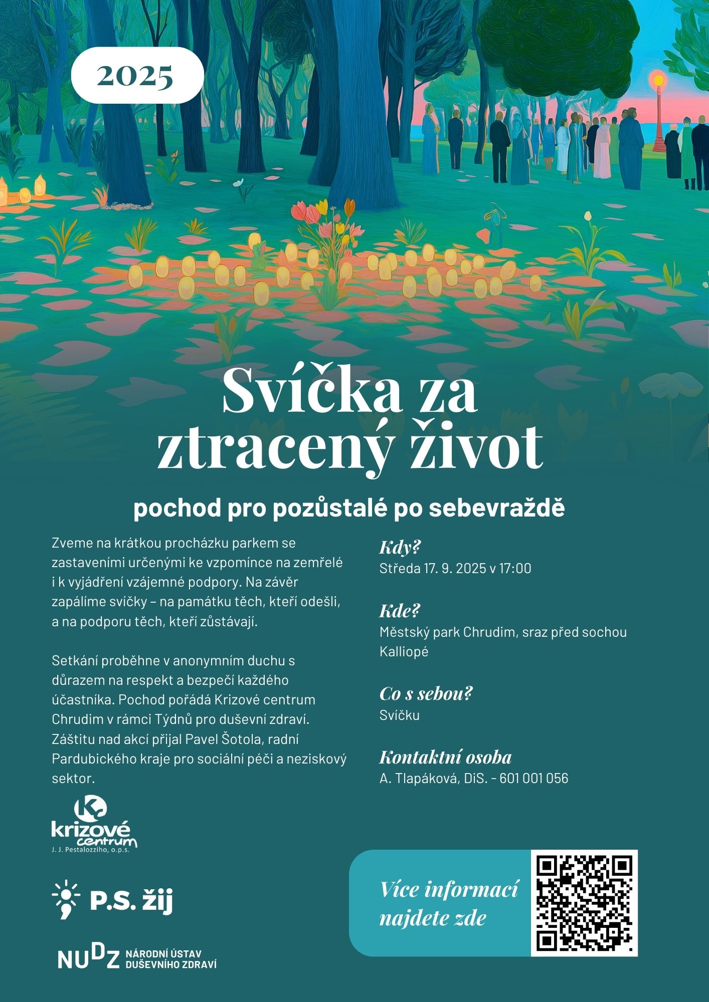 Čeká nás krátká bezbariérová procházka parkem se zastaveními určenými ke vzpomínce na zemřelé i k vyjádření vzájemné podpory. Na závěr zapálíme svíčky na památku těch, kteří odešli, a na podporu těch, kteří zůstávají. Setkání proběhne v anonymním duchu s důrazem na respekt a bezpečí každého účastníka.